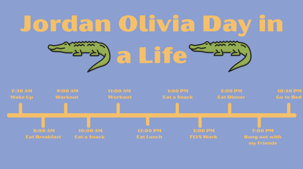 “In a typical day, I wake up at 7:30, eat breakfast, workout, eat a snack, workout, eat lunch at about noon, eat a snack, do FLVS, eat dinner at 8, hang out with my friends, and then go to bed at around 10:30,” Olivia said.